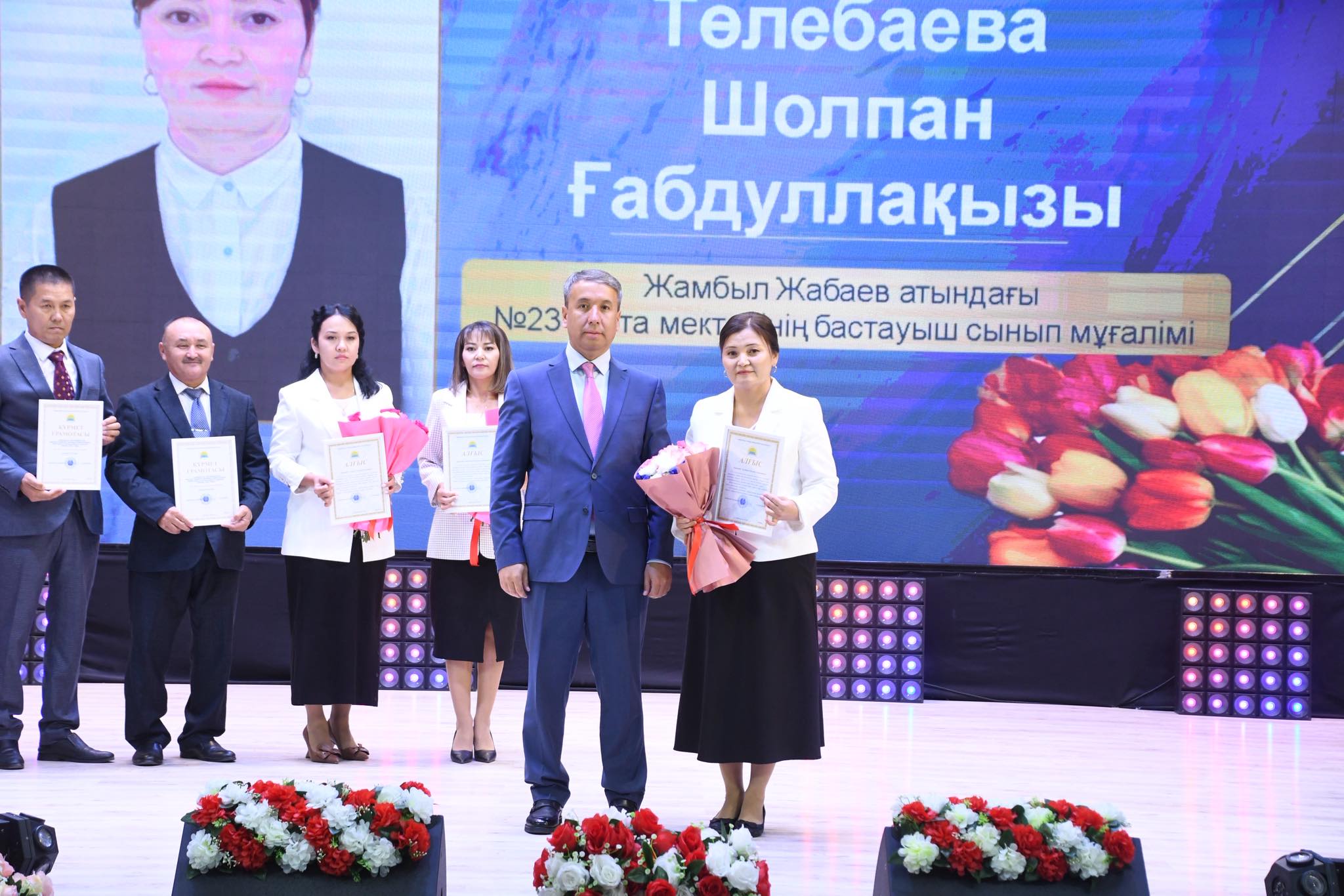 Бұдан кейін білім саласында толағай табысқа жетіп, шәкірттерді шыңға шығарып жүрген бірқатар ұстаздар марапат төрінен көрінді. Олар ҚР Оқу-ағарту министрлігі, облыс, аудан әкімінің, білім басқармасының «Құрмет грамотасы» және «Алғыс хатымен» марапатталды. Ал, Ақтан батыр ауылындағы №190 орта мектебінің химия пәнінің мұғалімі Алтынгүл Мұратбайқызы ҚР Оқу-ағарту министрлігінің «Білім беру ісінің құрметті қызметкері» төсбелгісі және бірқатар ардагер ұстаздарға ҚР Оқу-ағарту министрлігінің «Еңбек ардагері» төсбелгісі табысталды. Марапаттау рәсімінен кейін мерекеге орай сахна төріне аудан әкімінің ықылас гүлі шығарылып, барша ұстаздарға құрмет көрсетілді.